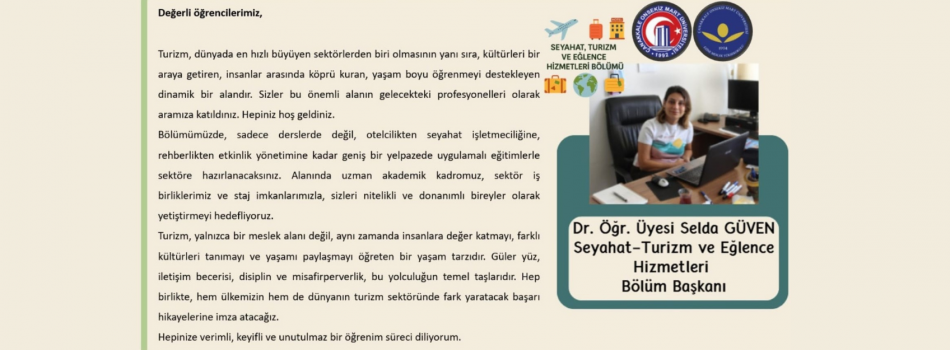 Bölümümüz Turizm ve Seyahat Hizmetleri Programı, turizm ve seyahat endüstrisin de yaşanan güncel gelişmeleri takip ederek bunu eğitim ve öğretim programına yansıtan çağdaş, çevreci, yenilikçi yapısı ile tercih edilen bir bölüm olmak vizyonu ile hareket etmektedir.