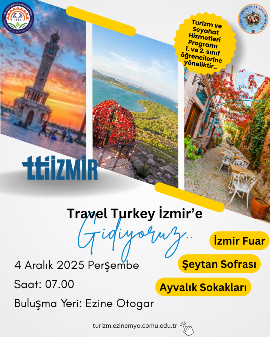 Bölümümüzün 1. ve 2. sınıf öğrencileri ile 4 Aralık 2025 Perşembe günü Travel Turkey İzmir Fuarına teknik gezi düzenlenecektir. Programa uygun olarak gezi, sabah saat 07.00’de Ezine Otogarından hareket ile başlayacaktır.